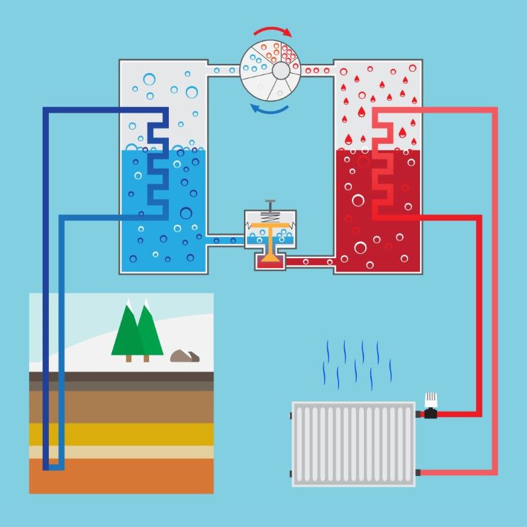 Wärme wird der Umwelt entzogen und auf nutzbarem Niveau in das Haus gebracht. Im Kältemittelkreislauf wird die Wärme aus Erdreich, Grundwasser oder Luft in der Wärmepumpe über einen Wärmetauscher, den sogenannten Verdampfer, auf ein flüssiges Kältemittel übertragen. Durch den sehr niedrigen Siedepunkt des Kältemittels, erwärmt es sich schnell und verdampft schon bei niedrigen Temperaturen. Anschließend verdichtet ein Kompressor das gasförmige Kältemittel, das sich dabei zusätzlich stark erhitzt. Die so erzeugte Wärme wird über einen zweiten Wärmetauscher, den Verflüssiger, vollständig an das Heizsystem und den Warmwasserspeicher abgegeben. Dadurch kühlt das Kältemittel stark ab und wird wieder flüssig. Das Kältemittel wird anschließend über das Expansionsventil zurück zum Verdampfer geleitet. Der beschriebene Prozess wiederholt sich, der Kreislauf ist geschlossen.