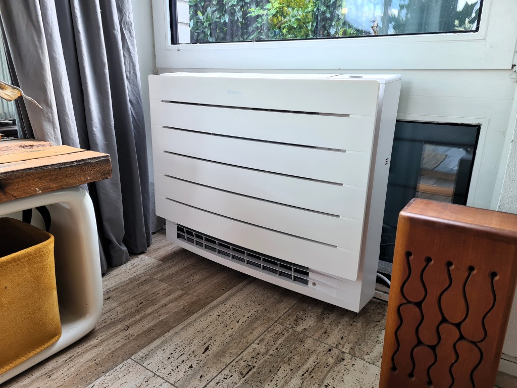 Die zwei Einheiten, Außen- und Innengerät, sind fest miteinander verbaut und durch Kupferleitungen miteinander verbunden.